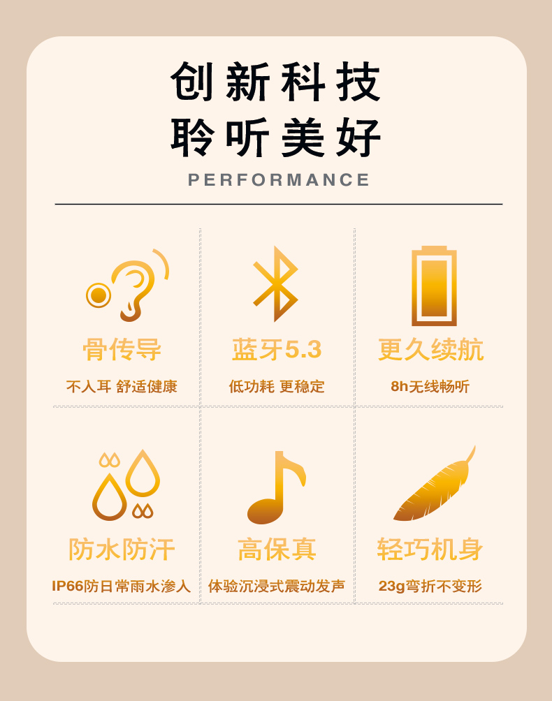 主要设计特色:1.抽拉木盒包装,时尚大气。2.真骨传导,不入耳不漏音。3.19.5克轻盈机身,轻松应对全天候佩戴。4.立体声效果,带来卓越声场表现。5.通讯隐私,严密守护,避免漏音打扰。6.8小时续航,消除电量焦虑。7.防汗防雨防泼溅,6级防水不在话下。8.不掉不晃,符合人体工学的贴设计,佩戴稳固。
