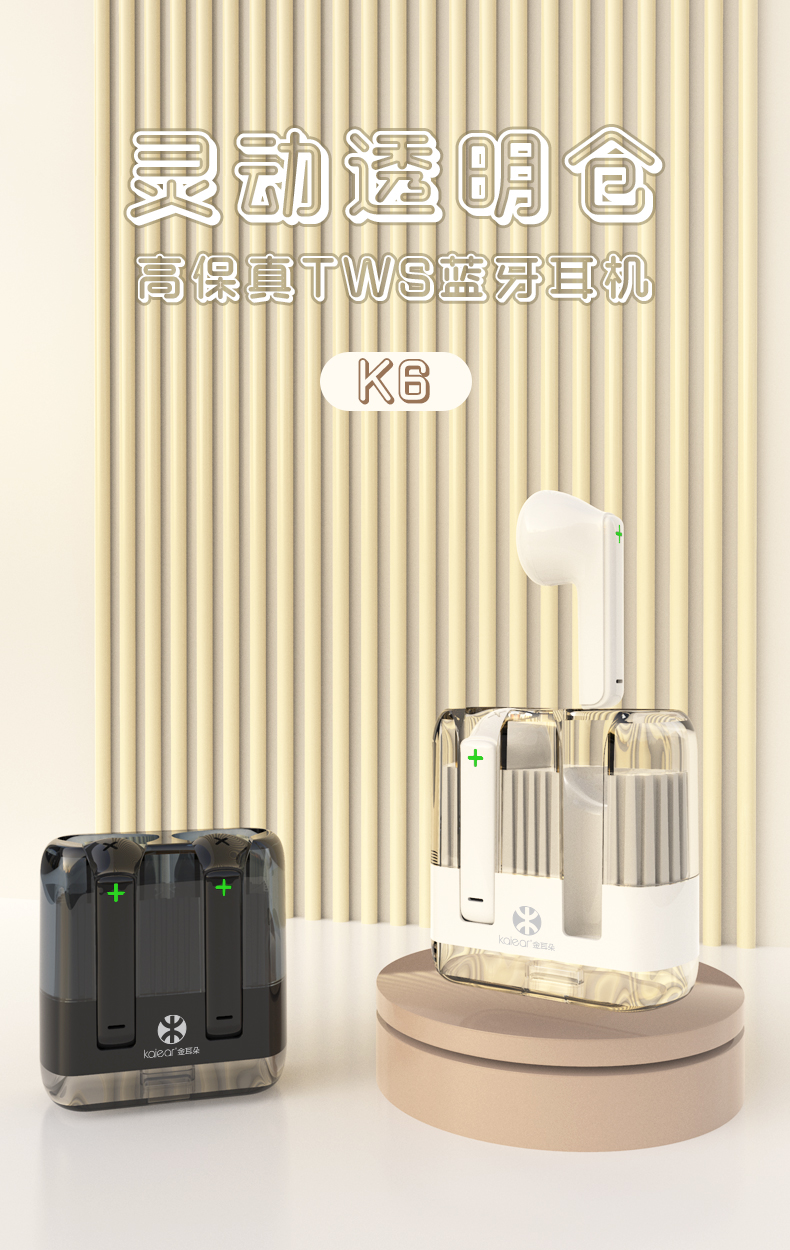 金耳朵k6是一款造型独特的蓝牙耳机,四四方方,有点像小烟盒,不仅带来了美的视觉体验,更增强了用户的使用效果,拿取方便,手感极佳。透明的充电仓外观,能够直观看到耳机的电路板,用料真实,经得起考验。