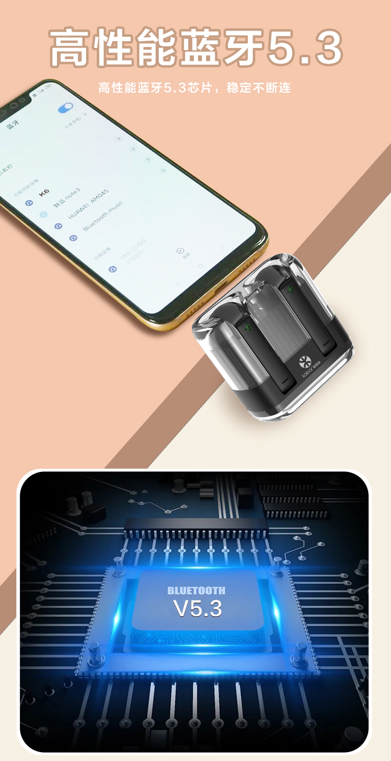 金耳朵k6同样也是使用最新的蓝牙5.3芯片,传输非常快且稳定,功耗更低,游戏听音延迟非常低,能给用户带来更好的感官娱乐体验。